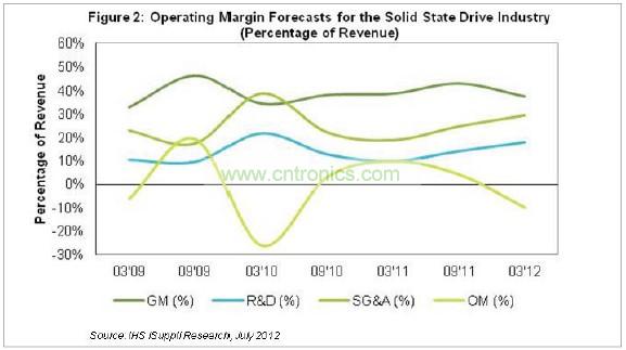 上次SSD產(chǎn)業(yè)出現(xiàn)營(yíng)業(yè)利潤(rùn)普遍為負(fù)的情況是在2010年上半年,與目前的情形類似。當(dāng)時(shí),幾家廠商加大銷售力度,以改善略高于35%的毛利率。這些努力取得了一些效果,2011年中期毛利率自2009年以來首次升到了40%以上。但由于產(chǎn)業(yè)競(jìng)爭(zhēng)加劇和營(yíng)業(yè)費(fèi)用增加,SSD毛利率在2011年第四季度重新跌至40%以下。