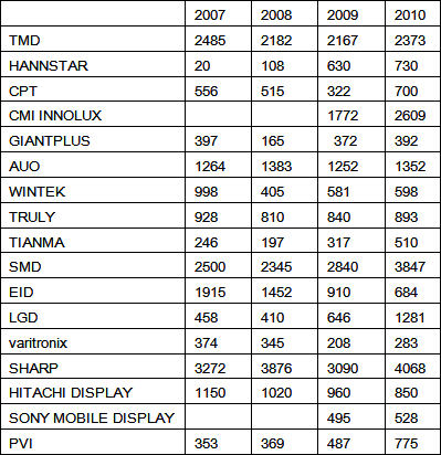 最后,中小顯示屏行業(yè)在一年內(nèi)也經(jīng)歷了比較大的變動(dòng)。華映(CPT)和彩晶(HANNSTAR)徹底轉(zhuǎn)型為中小顯示屏廠家。CPT在2010年出貨量高達(dá)3.52億片,比2009年增長(zhǎng)135%;HANNSTAR在2010年出貨量高達(dá)2.48億片,比2009年增長(zhǎng)505%。雖然出貨量大增,但是平均單價(jià)不高,毛利低。加上TFT-LCD生產(chǎn)線的高額折舊費(fèi)用,這兩個(gè)廠家還處于虧損的泥潭之中。