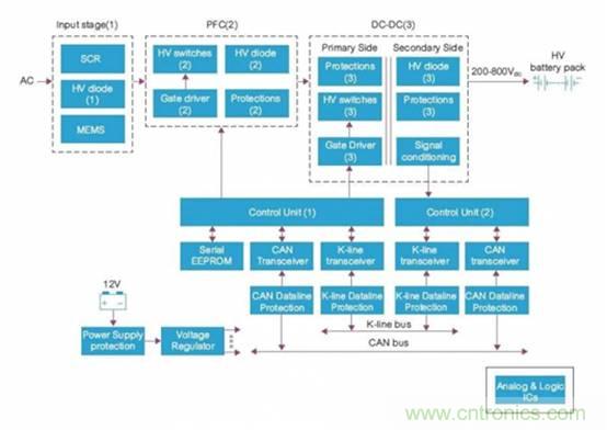 圖2 電動車電力系統(tǒng)框架圖。(數(shù)據(jù)源:意法半導(dǎo)體)