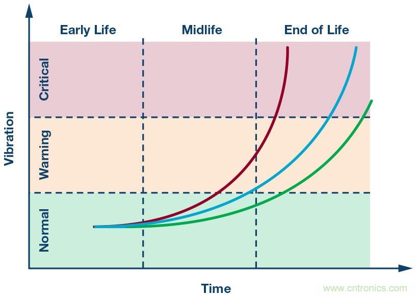 尚未使用的機(jī)器最初處于所謂的保修期。這屬于生命周期的早期階段,不排除這個(gè)階段會(huì)出現(xiàn)故障,但這種幾率相對(duì)非常小,且一般與生產(chǎn)故障有關(guān)。只有在接下來(lái)的定期維護(hù)階段,接受過(guò)相應(yīng)培訓(xùn)的維修人員才會(huì)開(kāi)始進(jìn)行針對(duì)性的干預(yù)。無(wú)論機(jī)器的實(shí)際狀態(tài)如何,他們都會(huì)按照指定的時(shí)間,或者在達(dá)到指定的使用時(shí)間后,對(duì)機(jī)器執(zhí)行例行維護(hù),例如,為機(jī)器換油。這種情況下,維護(hù)間隔期間出現(xiàn)故障的幾率也仍然非常低。隨著機(jī)器的使用時(shí)間增加,會(huì)逐漸到達(dá)狀態(tài)監(jiān)控階段。自此之后,應(yīng)做好故障應(yīng)對(duì)準(zhǔn)備。圖1顯示了以下6種變化,從超聲波范圍(1)的變化開(kāi)始,接著是振動(dòng)變化(2)。通過(guò)分析潤(rùn)滑油(3)或者通過(guò)稍微提高溫度(4),在實(shí)際發(fā)生故障之前,可以通過(guò)可感知的噪聲(5)或發(fā)熱情況(6)檢測(cè)出將要發(fā)生故障的前期跡象。振動(dòng)通常用于確認(rèn)老化情況。圖2顯示了三臺(tái)相同設(shè)備在生命周期內(nèi)的振動(dòng)模式。三臺(tái)機(jī)器在初始階段都處于正常范圍。但是,從中期階段開(kāi)始,根據(jù)具體的載荷情況,振動(dòng)或多或少快速增加;到后期階段會(huì)呈指數(shù)增加達(dá)到臨界范圍。一旦設(shè)備達(dá)到臨界范圍,則需要立即采取行動(dòng)。