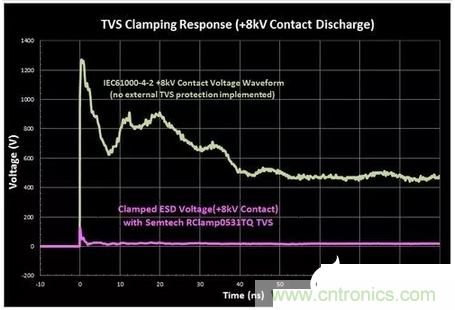 TVS Clamping Response ( 8kV Contact Discharge): TVS 鉗位響應(yīng)( 8kV 接觸放電)8kV Contact voltage waveform: 8kV 接觸電壓波形 No external TVS protection implemented: 沒有使用外部 TVS 保護(hù) Clamped ESD voltage( 8kV contact) with Semtech RClamp0531TQ TVS: 使用 Semtech RClamp0531TQ TVS 的鉗位 ESD 電壓( 8kV 接觸電壓)Time: 時(shí)間