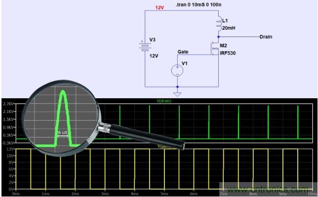 【導(dǎo)讀】在本文中,我們將看到一個(gè)包含噪聲和感應(yīng)負(fù)載尖峰的模擬。一個(gè)RC網(wǎng)絡(luò)或一個(gè)二極管可以節(jié)省你的mosfet和你的電路。使用的主要電子軟件是LTspice,一個(gè)高性能的SPICE仿真軟件、原理圖捕捉和波形查看器,它具有增強(qiáng)功能和簡(jiǎn)化模擬電路模擬的模型。