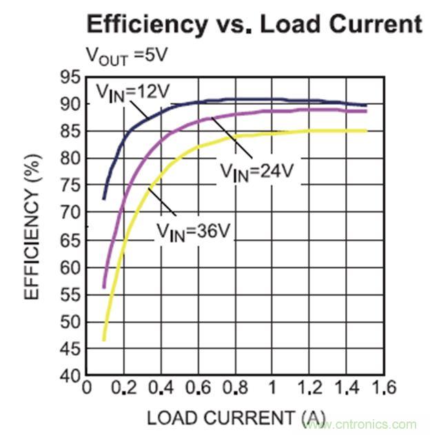 MPS先進(jìn)的半導(dǎo)體工藝實現(xiàn)了超低的集成功率MOSFET導(dǎo)通電阻,其上下管導(dǎo)通電阻通常分別為90mΩ/50mΩ。 在12V輸入、5V / 1A輸出條件下,可以實現(xiàn)高達(dá)90.8%的出色效率(見圖3)。