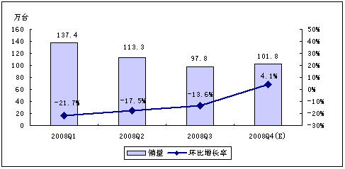 賽迪顧問預測,受全球經(jīng)濟危機以及中國經(jīng)濟發(fā)展趨緩等因素影響,2008年第四季度,MP3/PMP播放機行業(yè)將不會呈現(xiàn)快速增長的勢頭,但年終禮品市場的啟動,在一定程度上仍然會拉動整體市場向前發(fā)展。賽迪顧問預計,2008年第四季度,中國MP3/PMP播放機市場銷量為134.0萬臺,銷售額將達7.9億元。