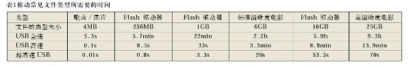 因此,基于Flash的外圍設(shè)備將受益并最終需要高得多的超高速USB 數(shù)據(jù)傳輸速率。其中,包括最常見的USB外圍設(shè)備——無(wú)處不在的Flash 驅(qū)動(dòng)器!表1總結(jié)了從USB全速到高速,再到超高速USB的用戶體驗(yàn)。需要與個(gè)人計(jì)算機(jī)之間進(jìn)行大量文件或較大文件快速移動(dòng)的多媒體應(yīng)用將會(huì)從超高速USB中獲益良多。它為那些需要在計(jì)算機(jī)和便攜式消費(fèi)類產(chǎn)品之間同步多媒體數(shù)據(jù)的用戶提供了滿意的帶寬。