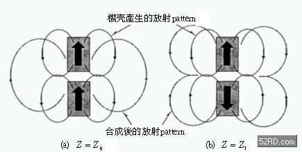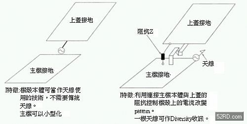 此處采取在連接移動(dòng)通訊系統(tǒng)折疊機(jī)殼上增設(shè)阻抗(Impedance)Z,如此就能夠利用一種天線獲得多樣的放射pattern,這種設(shè)計(jì)最大優(yōu)點(diǎn)是可以大幅縮小天線的設(shè)置場(chǎng)所與天線結(jié)構(gòu)物的尺寸。