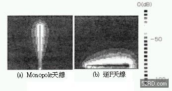 由上式可知如果縮任意小天線大小的話,Pr會(huì)比Pd小導(dǎo)致放射效率大幅降低,這種現(xiàn)象尤其是天線附近的電磁界更加明顯。圖2是提供相同電力給兩種天線時(shí),天線附近的實(shí)際電界分布狀態(tài),圖中的單極(Monopole)天線高度為λ/4(此處λ表示天線頻率的對(duì)應(yīng)波長(zhǎng))屬于中等大小天線,此時(shí)單極天線最大強(qiáng)度大約是-20dB。