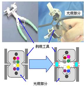 這種纜采用PVC緊套光纖,金屬吊線,PVC或LSZH做阻燃護套層,適合于室內(nèi)布線使用,性能穩(wěn)定可靠;采用小彎曲半徑光纖生產(chǎn),具有優(yōu)良的抗彎性能;阻燃;施工方便可靠??梢赃x用專門的工具進行剝纜,從光纜“V”形槽區(qū)域剝開,獲得緊套光纖,操作簡單。如圖3所示。