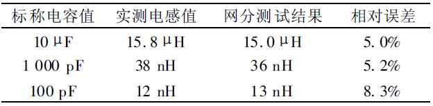 使用網(wǎng)絡分析儀測量寄生電感的方法為: 測量待測電容并聯(lián)情況下的正向傳輸曲線, 得到如圖1 所示的曲線, 讀出陷波點頻率, 并根據(jù)式(1) 計算出寄生電感值。表1 顯示了使用文中描述的測試儀測量的3 種數(shù)量級的電容器寄生電感的結果與采用網(wǎng)絡分析儀測量結果的對比情況, 表1中所示結果為多次測量取平均值之后的最終結果。