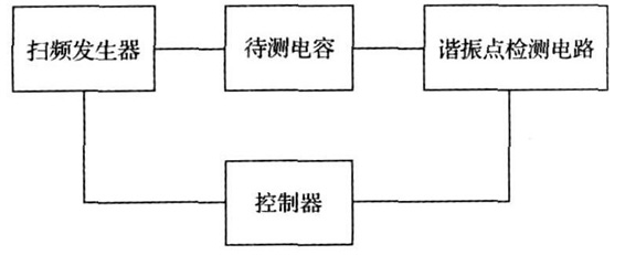 同時諧振發(fā)生時整個LC 回路表現(xiàn)出的阻抗為純阻性, 即感抗和容抗之和為零。利用這個原理, 使用一個掃頻信號激勵待測電容, 測量出諧振頻率, 再結合式(1) 即可測出寄生電感的大小 。根據(jù)該原理, 設計1 個掃頻發(fā)生器產(chǎn)生掃頻信號激勵待測電容, 然后找出諧振點, 讀出諧振頻率即可求出電容的寄生電感。其結構如圖3 所示。