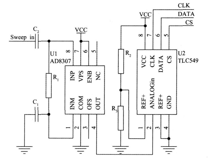 由于該檢測電路只是檢測出諧振點,即圖2 中的最低點, 只是一個比較關系, 并未對檢測到的最低點的電平精度有很高要求, 因此對采樣電路的精度要求不高,又因為對數(shù)檢波器的輸出是直流信號, 所以常見的大多數(shù)低速AD 轉換器都可以滿足要求。這里采用串行8 位的AD 轉換器TLC549。TL549 采用三線制串行控制方法, 很方便與單片機控制器接口。該檢測電路的原理圖如圖5 所示。