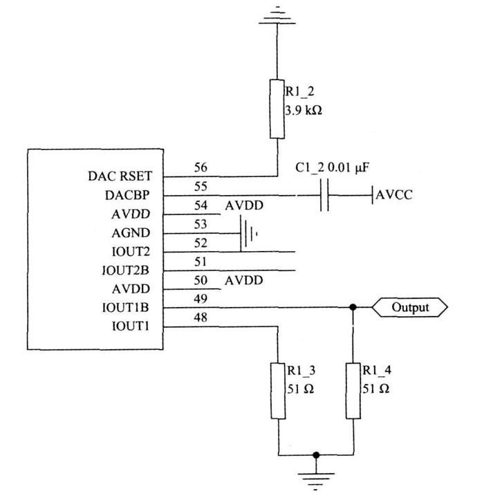 掃頻發(fā)生器在本系統(tǒng)中產(chǎn)生寬頻帶掃頻信號以激勵待測電容, 當電容較大時,以常見的電解電容為例,假設電容為1 000 F, 其寄生電感為100 nH, 則按照式(1)可計算出其自諧振頻率為15. 9 kHz, 諧振頻率較低;另以瓷片電容為例, 假設其電容值為10 pF, 寄生電感約為10 nH, 則其自諧振頻率為500 MHz 這兩個信號頻率相差了4 個數(shù)量級, 這就需要1 個寬帶的信號發(fā)生器, 這也是本部分的設計難點所在。若采用傳統(tǒng)的模擬信號發(fā)生的方法, 為了實現(xiàn)信號頻率的可調(diào), 一般會采用變?nèi)荻O管構成的LC 振蕩器, 然而在信號頻率較低時, 所需要的變?nèi)荻O管的電容量會很大,而傳統(tǒng)的變?nèi)荻O管電容值一般只是幾個pF 至幾百pF ,很難滿足低頻振蕩要求。為了簡化掃頻電路, 以及實現(xiàn)數(shù)字化控制, 這里采用DDS 技術產(chǎn)生寬帶信號。DDS 采用的是DA 轉換器的原理, 通過計數(shù)器累加實現(xiàn)的連續(xù)波形輸出 , 而DDS 芯片外圍電路簡單, 通過寫它的寄存器便可實現(xiàn)信號頻率的調(diào)節(jié), 同時產(chǎn)生的信號頻率分辨率高,一般可以達到0. 01 Hz 級別, 信號頻率的跨度大, 可以實現(xiàn)從幾Hz 到幾百MHz 的連續(xù)信號, 非常適合做掃頻發(fā)生器。這里采用了AD9854 這款DDS 芯片, 它在300 MHz 時鐘驅(qū)動下, 按照乃奎斯特采樣定律可以產(chǎn)生最高150 MHz 的信號,為了得到信號較好的頻率則一般只得到最高100 MHz 的信號。若要得到高于100 MHz 的信號, 則可采用其高次諧波得到?;贏D9854 的信號發(fā)生電路如圖4 所示。限于篇幅,僅畫出了關鍵的輸出部分和電流設置部分。AD9854 內(nèi)置4~ 12 倍頻的時鐘倍頻器, 因此可以外加1 個較低頻率的時鐘,通過倍頻器倍頻至300 MHz, 這樣可以極大的降低高速片外時鐘對系統(tǒng)造成的電磁兼容性問題。AD9854 內(nèi)部有1個頻率控制字寄存器,通過寫該寄存器的值便可以改變輸出信號的頻率, 非常適合數(shù)字控制。同時由于時鐘采用的時晶體振蕩器,因此輸出頻率的穩(wěn)定度和分辨率都非常高, 一般為10- 6數(shù)量級。