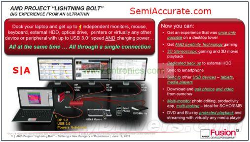 從硬件層面上看,Lightning Bolt其實(shí)很簡(jiǎn)單,驅(qū)動(dòng)級(jí)的硬件兼容性使得芯片上的USB通道及APU上的DP通道用一條線纜就可以連接起來(lái)并輸出到hub上。