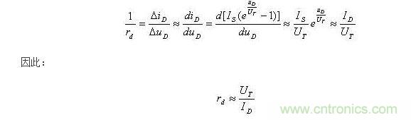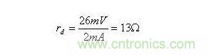 ID為靜態(tài)電流,常溫下UT=26mV??芍o態(tài)電流ID越大,rd將越小。設(shè)UD=0.7V時,ID=2mA。由此可得直流電阻RD=350,而動態(tài)電阻(交流電阻)為: