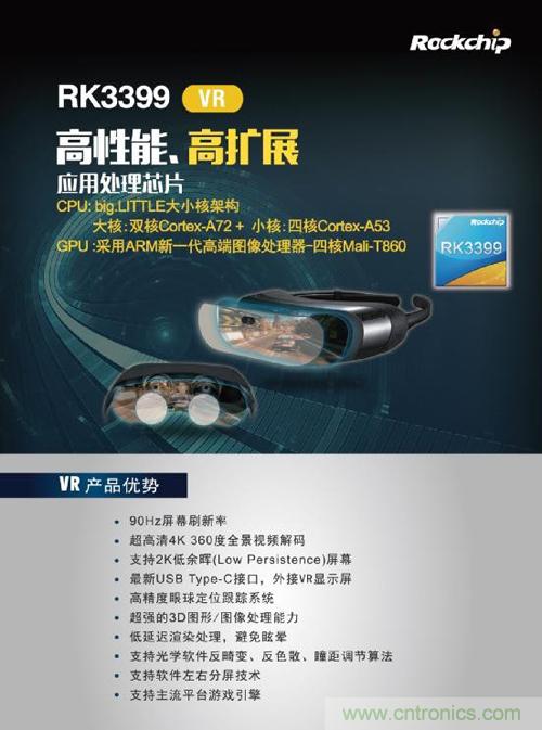RK3399的CPU基于Dual ARM Cortex-A72+Quad ARM Cortex-A53,采用ARM Mali-T860MP4 GPU。Mali-T860是ARM最新一代的高端圖像處理器。該GPU總體性能上比 T628提升了45%。更高端的VR解決方案RK3399,還具備多個(gè)看點(diǎn):集成雙USB3.0 Type-C接口、雙ISP像素處理,支持手勢(shì)識(shí)別、內(nèi)置PCI-e接口等等。這些新技術(shù)對(duì)VR產(chǎn)品實(shí)現(xiàn)更多應(yīng)用拓展性和可玩性,極大增強(qiáng)體驗(yàn)感和舒適度。
