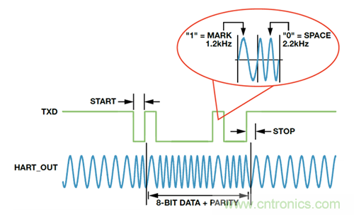 圖 2 顯示了調(diào)制涉及的主要模塊:FSK直接數(shù)字合成 (DDS)引擎、DAC(開關(guān)電阻串類型)和緩沖區(qū)。要發(fā)送的數(shù)字數(shù)據(jù)通過UART輸入。調(diào)制器通過將RTS(請求發(fā)送)信號拉低來使能。調(diào)制器將TXD輸入端的UART編碼HART數(shù)據(jù)位流轉(zhuǎn)換成一系列二進制 1200 Hz(“1”)和 2200 Hz(“0”)信號音(見圖 3)。DDS在任何一種頻率下生成正弦數(shù)字字流,DAC將其轉(zhuǎn)換為大約 493 mV的p-p模擬正弦波。此正弦波信號在內(nèi)部進行緩沖并在HART_OUT引腳上輸出。該DDS引擎本身會產(chǎn)生連續(xù)相位信號,因此在頻率之間切換時避免了出現(xiàn)任何輸出不連續(xù)。在HART_OUT上進行內(nèi)部緩沖的主要優(yōu)勢是產(chǎn)生很高的驅(qū)動能力,無需外部模擬緩沖,也不會出現(xiàn)它們帶來的問題。HART_OUT引腳直流偏置至 0.75 V,并應(yīng)容性耦合至負載。有關(guān)更多詳細信息,請參見AD5700/AD5700-1 數(shù)據(jù)手冊。