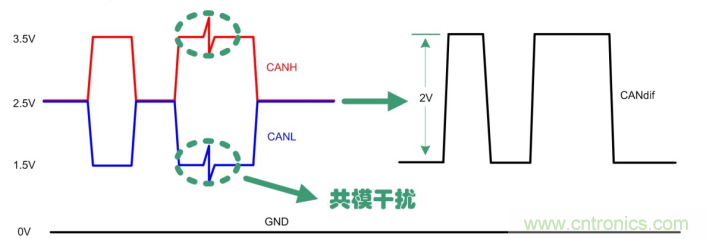 總線固有的差分傳輸形式使得CAN對(duì)于共模干擾有很好的抑制能力,如圖 4所示,通過CANH、CANL相減可很好地消除來自外部的共模干擾,但CANH、CANL并非理想對(duì)稱,快速上升的跳變沿,這些均會(huì)帶來EMC問題。我們通過示波器看總線波形很完美,測(cè)試靜電,EFT,浪涌,傳導(dǎo)騷擾抗擾均無異常。但測(cè)試傳導(dǎo)發(fā)射,則不能滿足限值要求,看起來很正常的總線實(shí)際卻向外在發(fā)送傳導(dǎo)干擾。