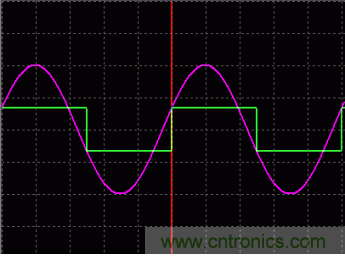 圖 1b. 對同一正弦波每周期采樣兩次,得到一個方波,幅度信息丟失。