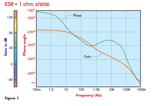 基本的閉環(huán)線性調(diào)節(jié)器系統(tǒng)由誤差放大器、輸出驅(qū)動器和負載組成。圖 1 至圖 3 詳細介紹了雙極性線性穩(wěn)壓器的閉環(huán)頻率響應(yīng),突出顯示了在保持系統(tǒng)設(shè)置和輸出電容值相同的情況下改變輸出電容器 ESR 的效果。具有 1 歐姆 ESR(圖 1)的電容器是穩(wěn)定的,而具有非常低的 0.01 歐姆 ESR(圖 2)的電容器是不穩(wěn)定的;3 歐姆的較大 ESR(圖 3)也不穩(wěn)定。