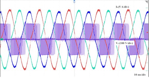 圖 2 所示的測試設(shè)置旨在對多種樣品在不同條件下(包括不同的結(jié)溫波動)執(zhí)行電源循環(huán)測試。如圖 3 所示,兩個三相轉(zhuǎn)換器背對背連接以循環(huán)電力。負載轉(zhuǎn)換器用于將通過電感器的電流調(diào)節(jié)為所需的幅度和相位。