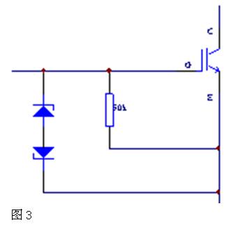 這時(shí)若集電極和發(fā)射極處于高壓狀態(tài)時(shí),會(huì)使IGBT發(fā)熱,極易引起IGBT損壞。為防止此類情況發(fā)生,可在IGBT的柵極與發(fā)射極間并接一只50~100歐姆的電阻,此電阻應(yīng)盡量靠近柵極與發(fā)身極。如圖3所示。