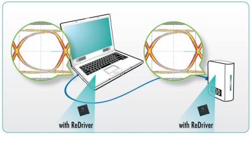 如果放在接收器之前,轉(zhuǎn)接驅(qū)動器可以有效打開信號眼圖的開口,從而將信號質(zhì)量恢復(fù)到可以接收的范圍內(nèi)。轉(zhuǎn)接驅(qū)動器可以調(diào)節(jié)信號、使用信號均衡的功能減少信號衰減和抖動,因此可以在更長的距離和通過多個連接器的情況下提供干凈的信號傳送通道。信號可以恢復(fù)原有的強度再次傳送,就像是將信號通道拆成數(shù)個段落,并且在每個段落恢復(fù)信號的質(zhì)量。轉(zhuǎn)接驅(qū)動器也允許產(chǎn)品設(shè)計師依照特定的應(yīng)用類型調(diào)整最佳的信號均衡效果,因此可以確保設(shè)備可以通過最嚴格的USB3.0認證要求。