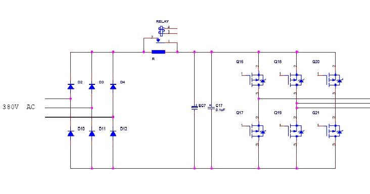 大家可以看出圖上標(biāo)出15KW的地方,就是我們的繼電器應(yīng)用的地方,一般在15KW以下的變頻器上的保護(hù)工作都是由繼電器來(lái)完成的,大于15KW的變頻器都是用接觸器來(lái)保護(hù)的,繼電器主要完成的作用為,大家知道當(dāng)電機(jī)啟動(dòng)會(huì)有一個(gè)很大的沖擊電流,為了對(duì)變頻器進(jìn)行保護(hù),先用繼電器把這個(gè)大的沖擊電流擋住,也就是繼電器處于常開狀態(tài),等電流恢復(fù)到正常,繼電器關(guān)閉,把那個(gè)電阻短路,所以此處的繼電器一般都是需要電流比較大的,例如omron的G8P型繼電器,由于此處繼電器對(duì)電機(jī)有比較重要的作用,所以一般客戶都會(huì)選擇質(zhì)量較好的繼電器,有用OEG的,有泰科的,也有松川的。如果在15KW以上的變頻器,一般客戶不會(huì)選擇用繼電器來(lái)保護(hù),由于沖擊電流太大,一般客戶會(huì)選擇接觸器來(lái)保護(hù),但是接觸器的價(jià)格要比繼電器貴的多。還有一個(gè)地方,就是變頻器上都會(huì)有給客戶留的無(wú)源觸點(diǎn),這個(gè)地方會(huì)用繼電器當(dāng)開關(guān)使用。