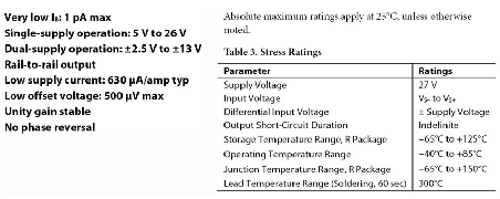 圖2:AD8625/AD8626/AD8627運算放大器的"主要特性"和絕對最大值規(guī)格