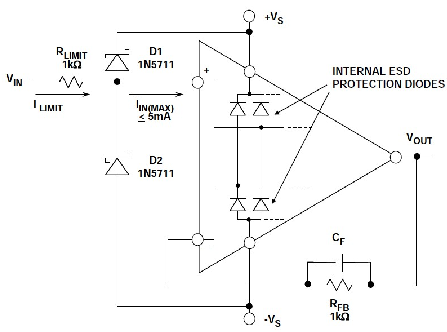 某些運算放大器,如OP27等,內(nèi)置保護二極管,但仍然需要限流。如果運算放大器具有保護二極管,它通常會規(guī)定最大差分輸入電流。原理示意圖上也應(yīng)顯示該保護電路。