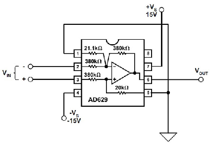 分析該拓撲結(jié)構(gòu)可知,精密運算放大器AD629周圍的阻性網(wǎng)絡(luò)充當(dāng)一個分壓器,將施加于VIN的共模電壓降低20倍。AD629同時以單位增益將輸入差模信號VIN轉(zhuǎn)換成以本地接地為基準的單端輸出信號。增益誤差不超過±0.03 %或±0.05 %,失調(diào)電壓不超過0.5 mV或1 mV(取決于器件等級)。AD629的電源電壓范圍是±2.5 V至±18 V.