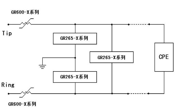 目前本公生產(chǎn)的GR265-X和GR600-X 等系列高分子PTC 熱敏電阻和半導體固體放電管一起用于總配線架的保安單元中,可以滿足過流和過壓保護的要求,同時幫助保安單元滿足中國通信行業(yè)標準 YD/T 694-1999-2002、北美 TelcordiaGR-974 及 ITU-T K.20 等標準,典型的使用電路如上圖所示。