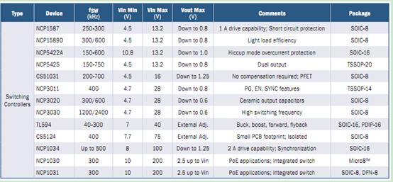 安森美半導(dǎo)體的開關(guān)控制器的關(guān)鍵特性包括寬輸入電壓范圍、緩沖的外部高于1.25 V的電壓參考、電源良好+啟用/禁用引腳、外部同步和輸出過壓和欠壓保護(hù)。根據(jù)型號不同,具有支持短路保護(hù)、高輕載能效、斷續(xù)(hiccup)模式過流保護(hù)、雙輸出、無需補(bǔ)償、PG/EN/SYNC功能、使用陶瓷輸出電容、高開關(guān)頻率、降壓/升壓/正前/反激、支持小PCB面積、支持隔離、PoE應(yīng)用、集成開關(guān)等特性,詳見下表。