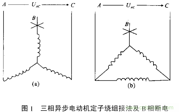 圖1是三相異步電動(dòng)機(jī)定子繞組,其中(a)為星型接法缺相運(yùn)行的接線圖,(b)為三角形接法缺相運(yùn)行的接線圖。此時(shí)接通電源后,流經(jīng)定子繞組的是單相電流,它們的相位相同,在氣隙中只能建立脈振磁場(chǎng),故電機(jī)無(wú)啟動(dòng)轉(zhuǎn)矩,合閘后電機(jī)不轉(zhuǎn)動(dòng)并伴有嗡嗡聲,此時(shí)電流很大,如果不及時(shí)斷開(kāi)電源,則有可能燒毀電機(jī)。三相異步電動(dòng)機(jī)出現(xiàn)缺相運(yùn)行時(shí),在氣隙中建立的是脈振磁場(chǎng),其表達(dá)式為:
