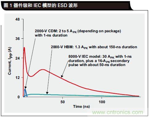 3、兩種模型在測試期間所用的電擊次數(shù)不同。HBM僅要求測試一次正電擊和一次負(fù)電擊,而 IEC 模型卻要求 10 次正電擊和 10 次負(fù)電擊??赡艹霈F(xiàn)的情況是,器件能夠承受第一次電擊,但由于初次電擊帶來的損壞仍然存在,其會在后續(xù)電擊中失效。圖1 顯示了 CDM、HBM 和 IEC 模型的 ESD 波形舉例。很