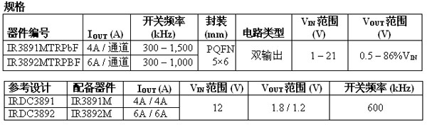 全新雙輸出器件對(duì)5V到12V輸入、1V到21V輸入 (使用5V外偏置) 單電源軌操作進(jìn)行了優(yōu)化。IR3891和IR3892采用了纖巧的5×6mm PQFN封裝,在165mm2的小巧占位面積內(nèi),分別為需要4A/通道或者6A/通道的應(yīng)用帶來(lái)極為緊湊的解決方案。