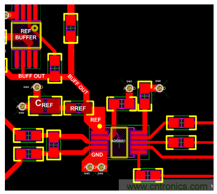 基準(zhǔn)緩沖器電路到REF引腳的跡線長度被保持盡可能的短,以確??焖俜€(wěn)定響應(yīng)。