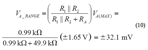 由于 DAC 可以擺動(dòng)±1.65 V,因此,總失調(diào)調(diào)整范圍可通過(guò)由 RA以及 R1和 R2的并聯(lián)組合形成的分壓器給定,其計(jì)算方法如下: