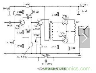 上面介紹的是單極放大器的負反饋,又叫小環(huán)負反饋。小環(huán)負反饋對改善各級放大器的性能起著重要的作用。對于多級放大器,還常從輸出端取反饋信號送回輸人端,這叫大環(huán)負反饋。大環(huán)負反饋對改進整機性能有顯著的作用。