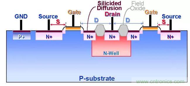 1、制程上的ESD:要么改變PN結(jié),要么改變PN結(jié)的負(fù)載電阻,而改變PN結(jié)只能靠ESD_IMP了,而改變與PN結(jié)的負(fù)載電阻,就是用non-silicide或者串聯(lián)電阻的方法了。