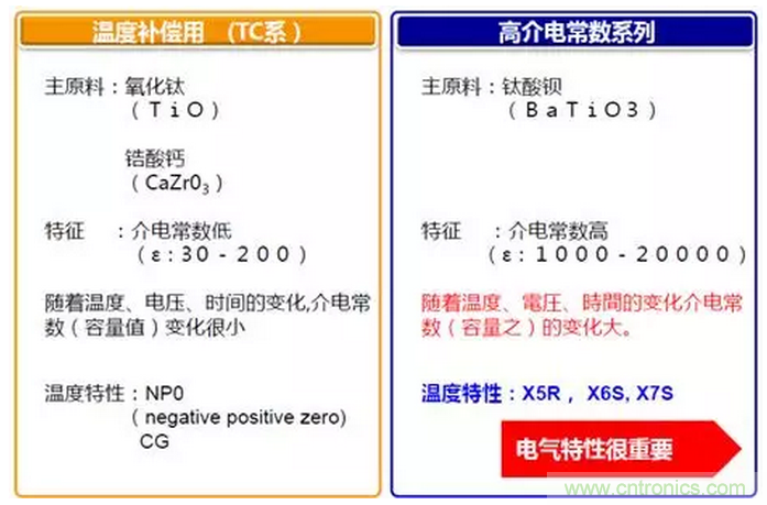 目前主流的陶瓷電容分類主要是按材質(zhì)來分,不同的材質(zhì),會有不同的容值,有不同的溫度系數(shù)。目前主要有以下材質(zhì):X5R,X7R,C0G,NP0,X6S,X7T等,這些又可以分兩大類,溫度補(bǔ)償型和高介電常數(shù),主要是溫度系數(shù)不同,溫度補(bǔ)償型主要是容值隨溫度變化小,但是容值做不高。高介電常數(shù)型,溫度系數(shù)不好,但是容值可以做的比較高。