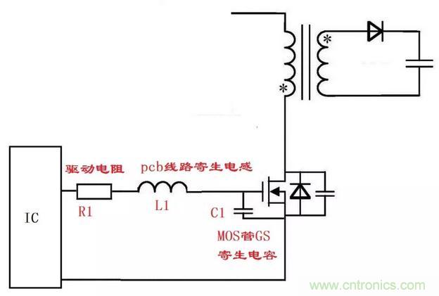 IC出來的波形正常,到C1兩端的波形就有振蕩了,實際上這個振蕩就是R1,L1和C1三個元器件的串聯(lián)振蕩引起的,R1為驅(qū)動電阻,是我們外加的,L1是PCB上走線的寄生電感,C1是mos管gs的寄生電容。