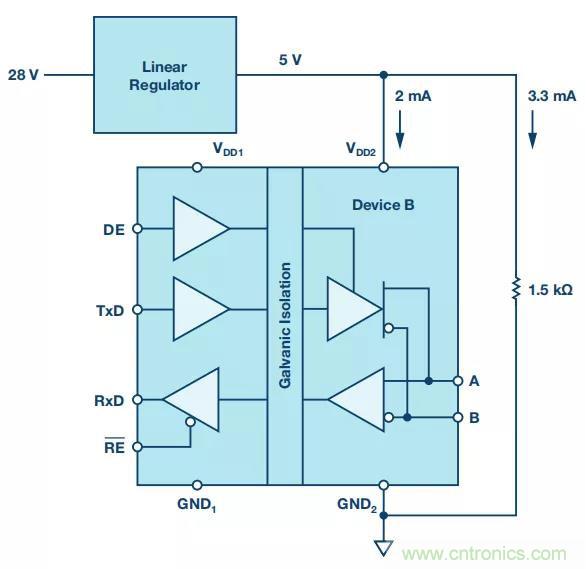 “更好”是一個(gè)定性術(shù)語(yǔ),具體取決于所討論的參數(shù)。例如,當(dāng)涉及到速度、CMRR、PSRR時(shí),越高越好;當(dāng)涉及到失調(diào)電壓、漂移時(shí),越低越好;而您不需要太多工程知識(shí)就知道功耗總是越低越好。真的是這樣嗎?在這個(gè)特殊案例中,并非如此。舊收發(fā)器閑置狀態(tài)下在總線側(cè)消耗15 mA (典型值)電流,而新器件僅消耗 2 mA (最大值)。毫無疑問,新器件在數(shù)據(jù)上看起來更好。不幸的是,線性穩(wěn)壓器似乎失常了。