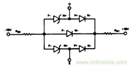 圖4舉例說明了通過在電源供電引腳串聯(lián)二極管(比如1N459)防止寄生晶體管導通的方法。如果S端或D端電壓高于電源電壓時,CR1和/或CR2反向偏置,基極驅動電路不能使晶體管導通。每個CMOS器件都應該有一對獨立的二極管對其進行保護。盡管這個方法很有效,但它不是萬無一失的。如果開關的一端連接到一個負電位(例如一個充電電容),并且另一端電壓超過VDD,則盡管有保護二極管。