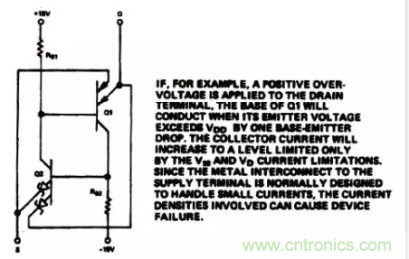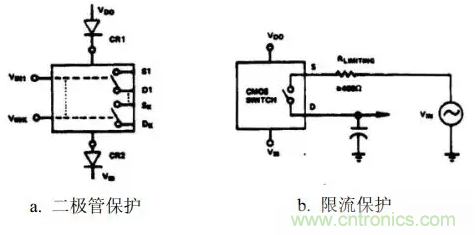 過壓能引起過大的電流和金屬化問題。通常,運算放大器的輸出作為S端或D端的電壓源,因此電流不能大于運算放大器直流輸出電流的限值。然而,瞬態(tài)感應電流仍有可能破壞CMOS器件;因此,有必要進行保護。
