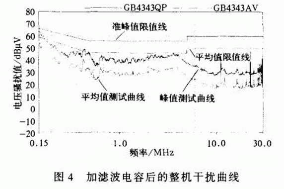 由圖4和表2可以看出,在加了濾波電容后,超出限值線的干擾均被濾掉。在實際應(yīng)用中,單一的電容器不可能在從低頻段到高頻段都能令人滿意。這種情況下可以將兩個不同類型的電容器并聯(lián)使用,會取得良好的效果。