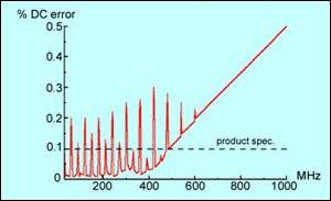大多數(shù)模擬設(shè)備的抗擾度問(wèn)題是由射頻解調(diào)引起的。運(yùn)放每個(gè)管腳都對(duì)射頻干擾十分敏感,這與所使用的反饋線路無(wú)關(guān)(見(jiàn)圖3),所有半導(dǎo)體對(duì)射頻都有解調(diào)作用,但在模擬電路上的問(wèn)題更嚴(yán)重。即使低速運(yùn)放也能解調(diào)移動(dòng)電話頻率及其以上頻率的信號(hào),圖4表明了實(shí)際產(chǎn)品的測(cè)試結(jié)果。