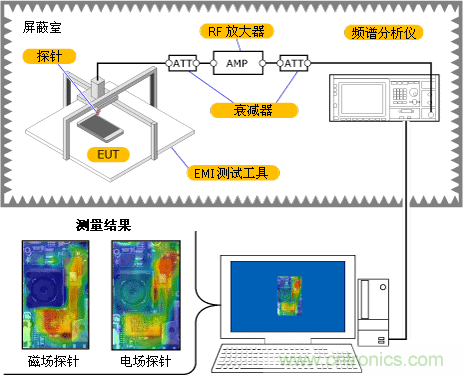 我們將EMI測試工具的電場探針和磁場探針通過RF放大器連接到頻譜分析儀,并對相鄰電磁場的分布進行了分析。