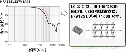 信號頻率為12MHz,同去除噪音所必須的頻帶700MHz相比頻率較低,為了接近信號頻率通過所必須的頻帶 (~100MHz) ,選擇了插入損耗曲線變化急劇,對信號頻率和噪音頻率選擇度較高的LC復合型EMI濾波器。因為信號線路很多,所以EMI濾波器為排容型NFA18SL系 列。在檢查靜噪效果和信號質(zhì)量之間平衡的同時,我們選擇了220MHz的截止頻率。