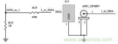 結合汽車電子MCU 端口特性以及標準要求,將接地端口與1Ω網(wǎng)絡相連,再與SMA口相接,引入EMI接收機進行監(jiān)控,原理圖如圖3、圖4所示。