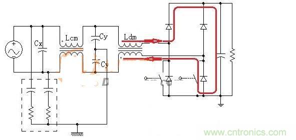 對于共模濾波,其電路是一個LCC型無源濾波器,由于Y電容一端要接外殼一般要求Y電容漏電流不能太大這就限制了Y電容的容量。參考圖2的差模濾波橋結(jié)構(gòu)為共模信號也搭建一個橋結(jié)構(gòu),見圖3只需多加兩個二極管。